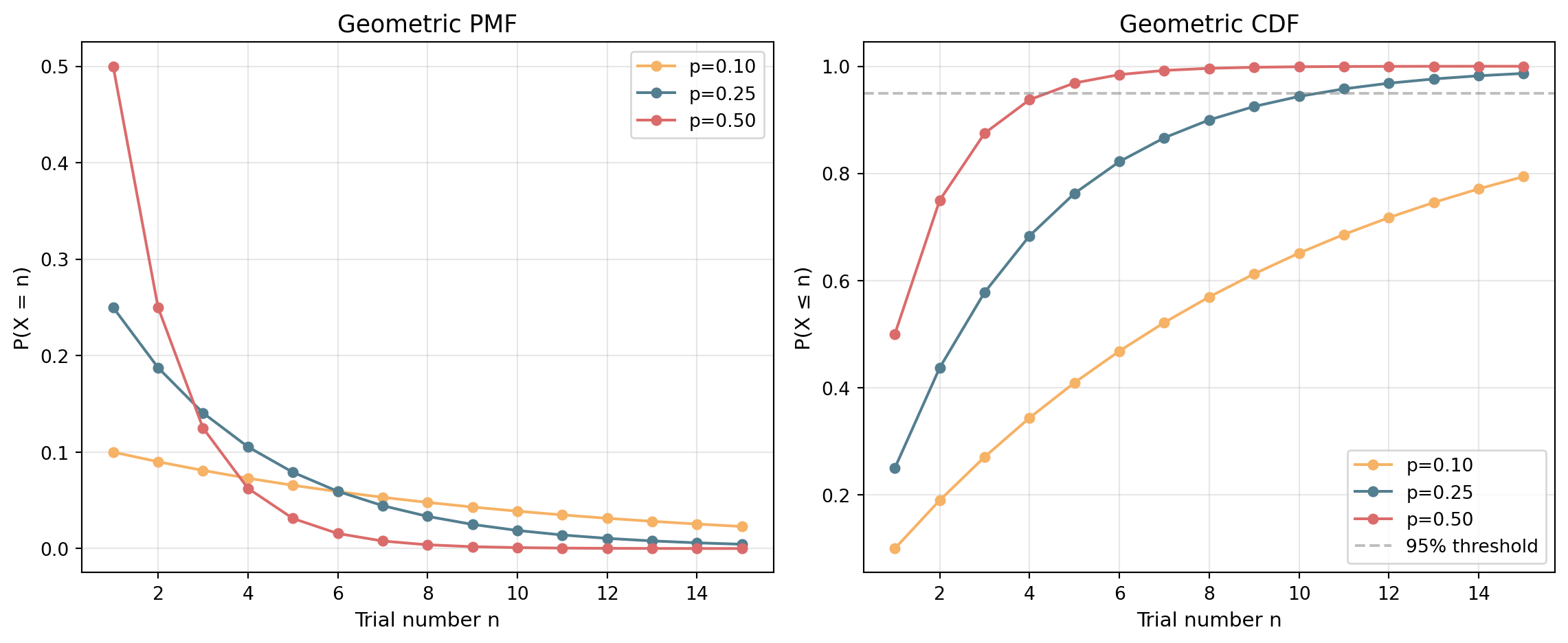 - Find the minimum \(n\) such that \(P(\text{at least one success}) \ge 0.95\).