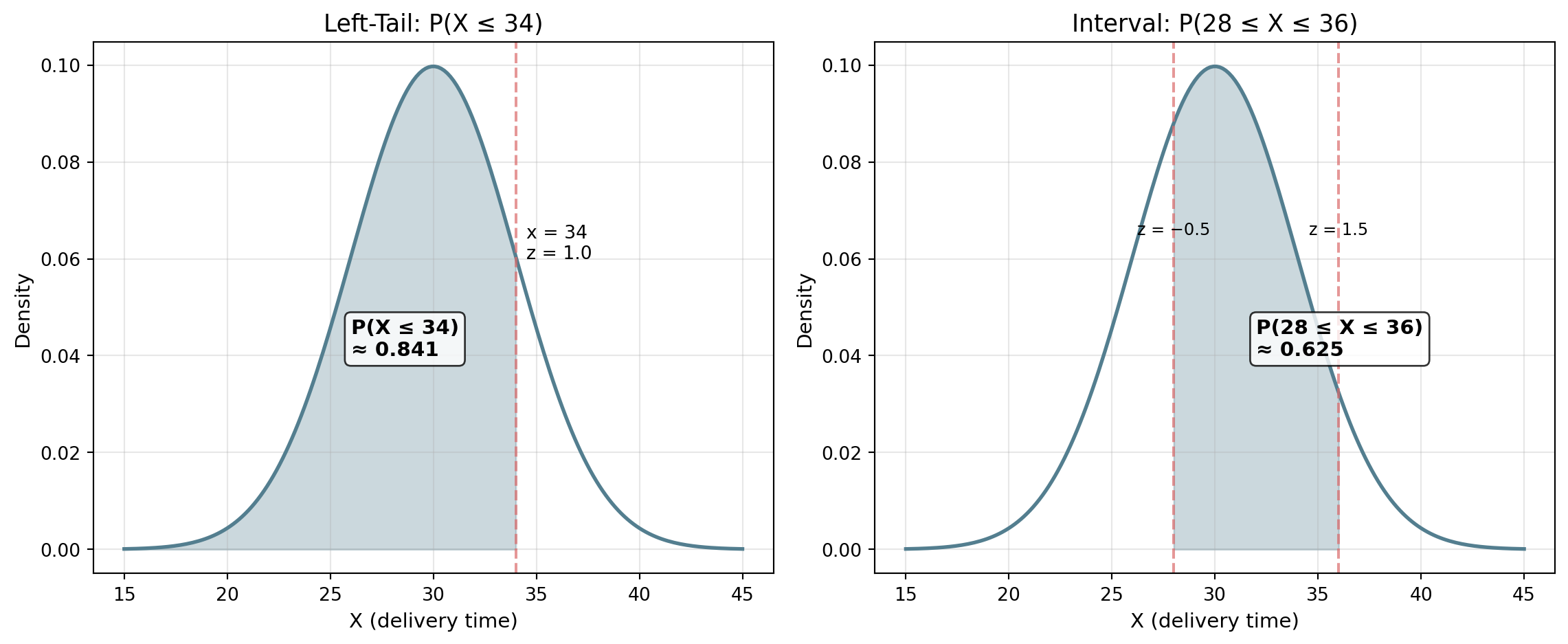 | \(P(a \le X \le b)\) | \(P\!\left(\frac{a-\mu}{\sigma} \le Z \le \frac{b-\mu}{\sigma}\right)\) |